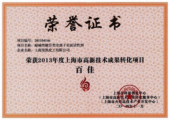 2014年11月20日下午,上海市科技創(chuàng)業(yè)中心主辦的“2013上海高新技術成果轉化年會暨上海市高新技術成果轉化百佳、自主創(chuàng)新十強項目表彰會”在上海科技創(chuàng)業(yè)服務中心大樓隆重舉行。上海發(fā)凱化工有限公司公司承擔的“耐堿性糖苷類非離子表面活性劑”項目連續(xù)兩年榮獲“百佳”稱號。