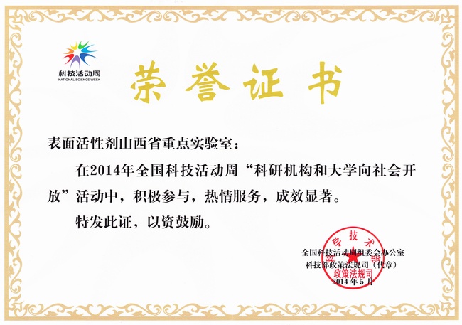 近日,我院表面活性劑山西省重點(diǎn)實(shí)驗(yàn)室因在全國(guó)科技活動(dòng)周中的突出表現(xiàn)受到科技部表彰。今年5月17至24日是全國(guó)科技活動(dòng)周,主題為“科學(xué)生活 創(chuàng)新圓夢(mèng)”?;顒?dòng)期間,山西省重點(diǎn)實(shí)驗(yàn)室采用科普講座、趣味實(shí)驗(yàn)、組織參觀(guān)等不同形式對(duì)來(lái)訪(fǎng)的太原理工大學(xué)現(xiàn)代學(xué)院、中醫(yī)學(xué)院附屬醫(yī)院、濱河小學(xué)及太原晚報(bào)陽(yáng)光天使小記者俱樂(lè)部等4家單位共計(jì)180余人進(jìn)行了表面活性劑相關(guān)知識(shí)的宣傳介紹;通過(guò)采用視頻展播、現(xiàn)場(chǎng)講解等方式宣傳了實(shí)驗(yàn)室的發(fā)展歷史、研究方向及科研成果;通過(guò)讓到訪(fǎng)者親身體驗(yàn)科學(xué)的魅力,達(dá)到了普及科學(xué)知識(shí),弘揚(yáng)科學(xué)精神的效果。通過(guò)本次科技活動(dòng)周,重點(diǎn)實(shí)驗(yàn)室為推動(dòng)科普進(jìn)程和全民科學(xué)文化素質(zhì)提高做出了努力,也擴(kuò)大了自身的社會(huì)影響力。
