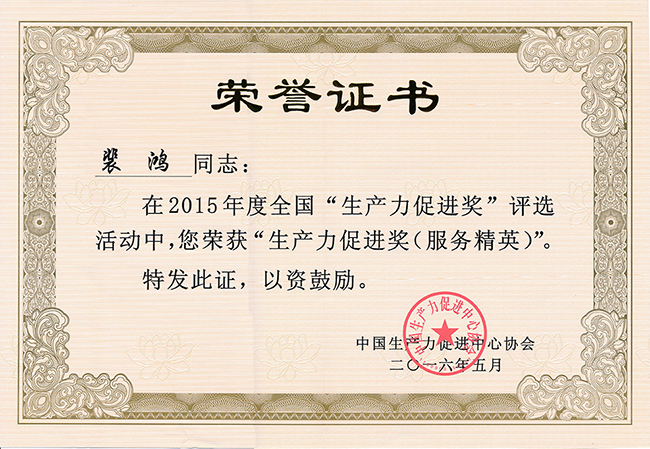 2016年5月22日至23日,中國日化院表面活性劑和洗滌劑行業(yè)生產(chǎn)力促進(jìn)中心副主任裴鴻赴四川省德陽市參加 “德陽杯2016中國好技術(shù)、生產(chǎn)力促進(jìn)獎(jiǎng)?lì)C獎(jiǎng)大會(huì)暨中國生產(chǎn)力高峰論壇”。會(huì)議由中國生產(chǎn)力促進(jìn)中心協(xié)會(huì)主辦,會(huì)上中國生產(chǎn)力促進(jìn)中心協(xié)會(huì)對2015年度獲得生產(chǎn)力促進(jìn)獎(jiǎng)的單位和個(gè)人進(jìn)行了表彰。裴鴻同志榮獲“2015年度全國生產(chǎn)力促進(jìn)獎(jiǎng)(服務(wù)精英獎(jiǎng))”榮譽(yù)稱號。