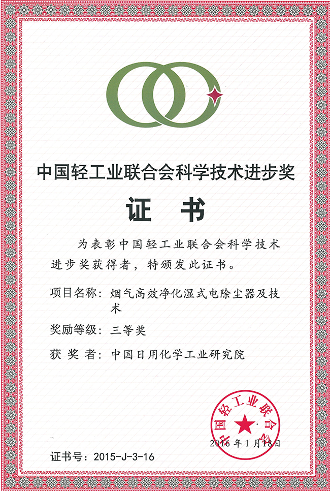 ? ? 2015年度中國輕工業(yè)聯(lián)合會科學(xué)技術(shù)獎頒獎活動于6月21日在北京舉行。此次聯(lián)合會授獎項目共144項。表面活性劑和洗滌劑行業(yè)生產(chǎn)力促進中心“洗滌劑用表面活性劑生物降解性能評價系統(tǒng)及數(shù)據(jù)庫平臺建設(shè)”獲科學(xué)技術(shù)進步二等獎;中國日化院“煙氣高效凈化濕式電除塵器及技術(shù)”獲科學(xué)技術(shù)進步三等獎。