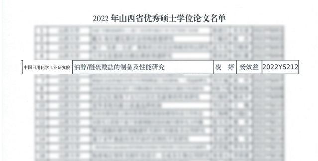 近日,山西省人民政府學(xué)位委員會(huì)辦公室公布2022年度山西省優(yōu)秀碩士學(xué)位論文,中國日化院2022屆碩士研究生凌婷撰寫的《油醇/醚硫酸鹽的制備及性能研究》學(xué)位論文獲此項(xiàng)殊榮,該論文由楊效益正高級工程師指導(dǎo)完成。